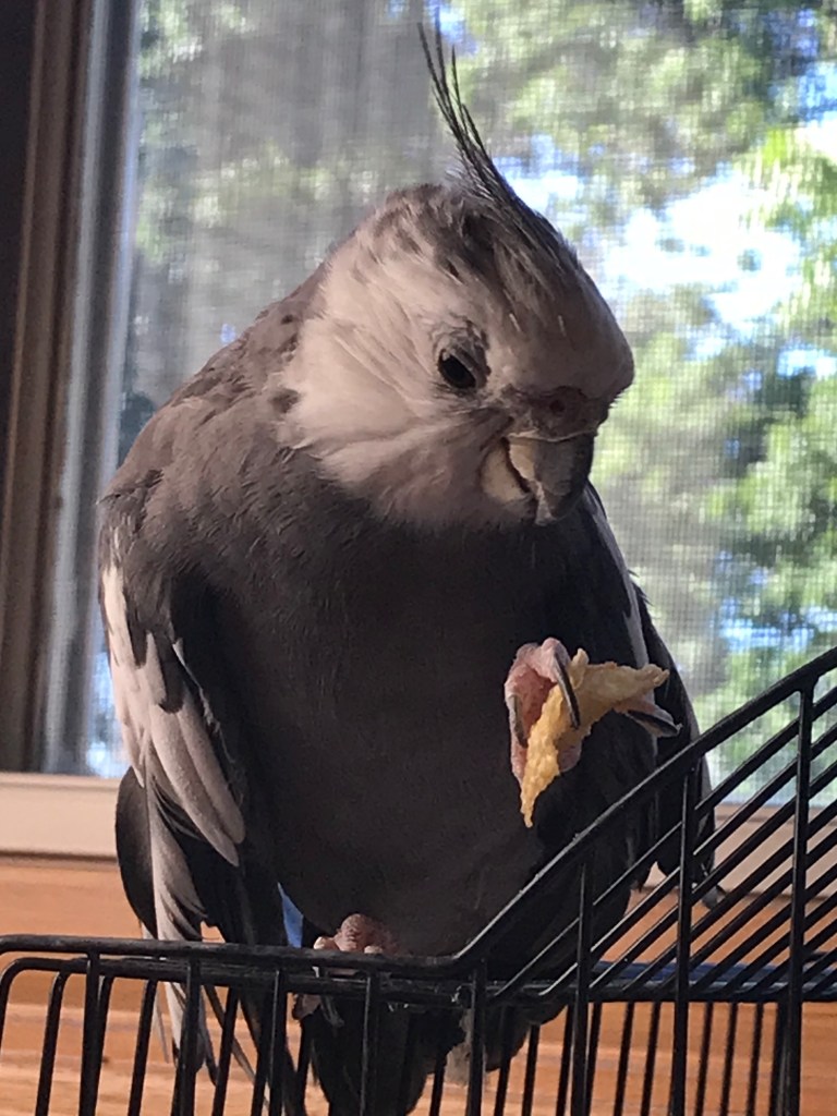 “Do I LOOK like a duck? Look at my feet. No webbing. Cockatiels, especially THIS cockatiel, nap when it’s rainy. I WAS napping until you woke me.”