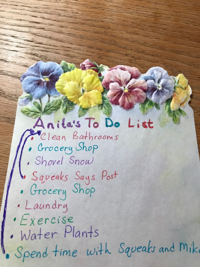 “Maybe a ‘To Do’ list will help. Then I’ll know what needs to be done. It’ll be ‘Anita’s List’ or ‘The A List’ for short.”
