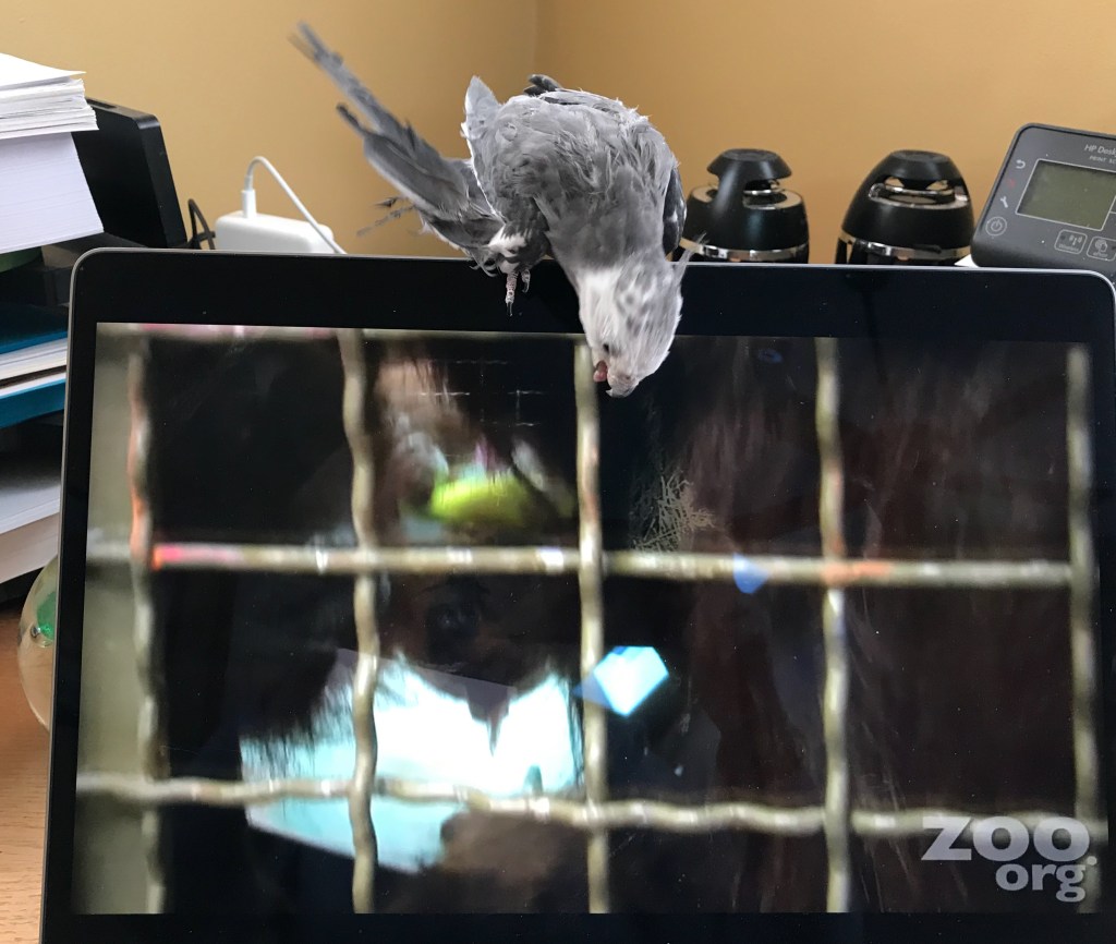 I climbed out of my rolly cage into my writing nest. Momanita climbed the stairs to HER writing nest. She scooted her chair to the computer and played the video. Snowball DID have the moves. I banged my beak and flared my crest. I had moves, too.