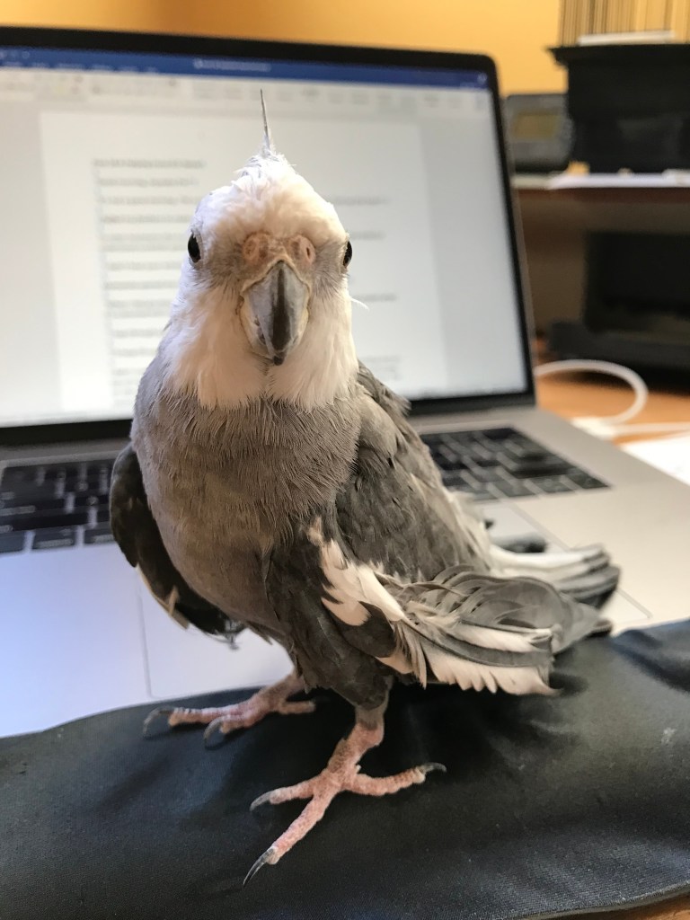I climbed out of my rolly cage into my writing nest. She scooted her chair to the computer and tapped the keyboard. While Momanita figured out how a bird test worked, I’d figure out how to pick the treats out of her pockets.
