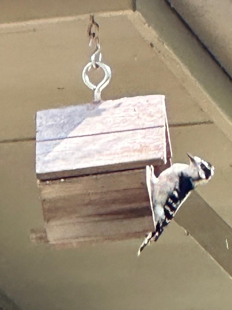 Last winter Momanita and I watched Ringo, a downy woodpecker, stuff herself with suet hung in the backyard. A wire covering protected the peanut butter and oat block from squirrel raids, but allowed Ringo to feast.